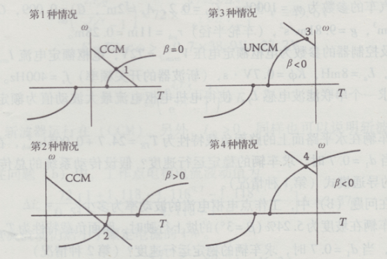 電動車系統的穩態工作點分析,工作點即電機轉矩一角速度特性曲線與路面負載特性曲線的交點。這里選取了電機轉矩-角速度平面上3個象限中的4個工作點,分別代表了4種斬波器運行模式,它們是象限內加速CCM(第1種情況),第四象限內加速CCM(第2種情況)。
