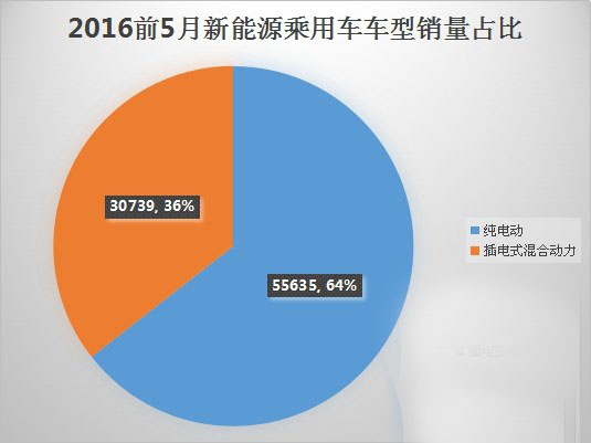 在前面的文章《電動汽車詳細分類》中我們已經對電動汽車進行了分類,下圖為乘聯會的統計數據,主要統計的為純電動和插電式混合動力的電動汽車,圖上顯示出2016年5月,國內銷售了純電動乘用車55635輛,為百分之64,銷售了插電式混合動力乘用車30739輛,為百分之36,合計銷售了8.6萬輛,同比增長了126%。