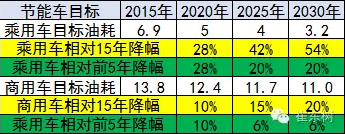 2030年的乘用車油耗要達到3.2升,較2015年的6.9升下降54%,而且每5年的環比下降幅度也是20%的驚人的高降幅,體現了乘用車的世界接軌決心。