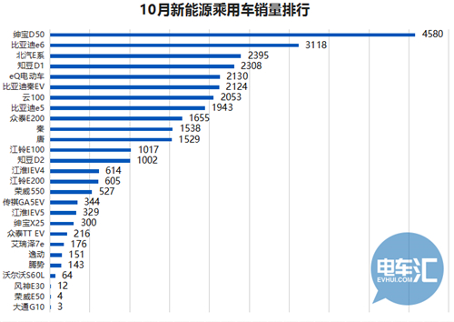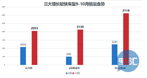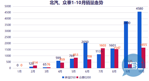 比亞迪e6、云100、eQ電動車三大車型銷量增速很大。眾泰E200本月銷量1655臺,上月僅僅326臺,而7月1603臺、8月1547臺,算是重新步入“正軌”。紳寶系列經歷了9月超過的增幅,10月同樣有20.5%的增幅,達到了4580臺,有著不錯的增速和勢頭。
