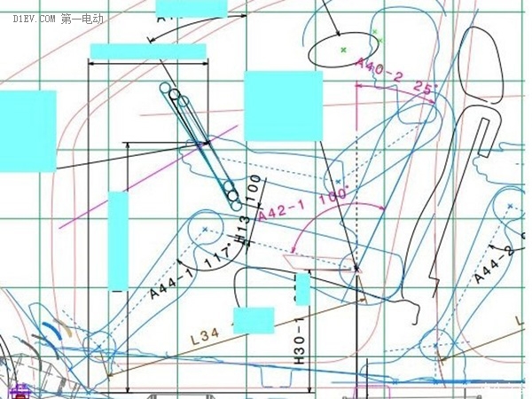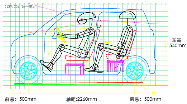 根據現有標準草案來看,低速電動車的尺寸,長<3.3米,寬<1.5米。我們以一款常見的4門4座位的低速電動車車型為例,其人體布置簡圖如下圖所示。