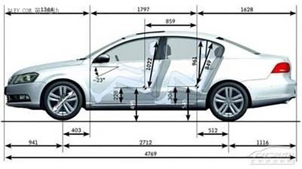 為方便分析,我們將之與一款常見的三廂轎車帕薩特的尺寸進行對比,該車型的外形尺寸為4769×1820×1472mm。其余尺寸如下圖:
